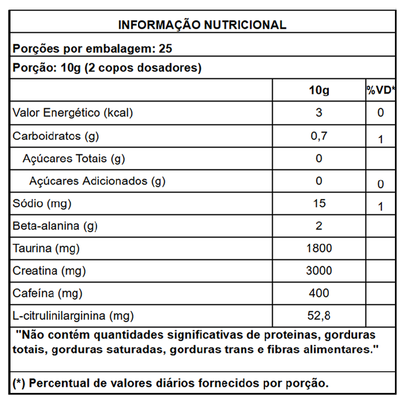 Sugestão de Uso: Consumir 1 copo dosador (5g) em 150ml de água, uma hora antes do treino, duas vezes ao dia. Não exceder a porção de 2 copos dosadores ao dia. Consumir 30ml a cada 2 horas, ou conforme orientação profissional.