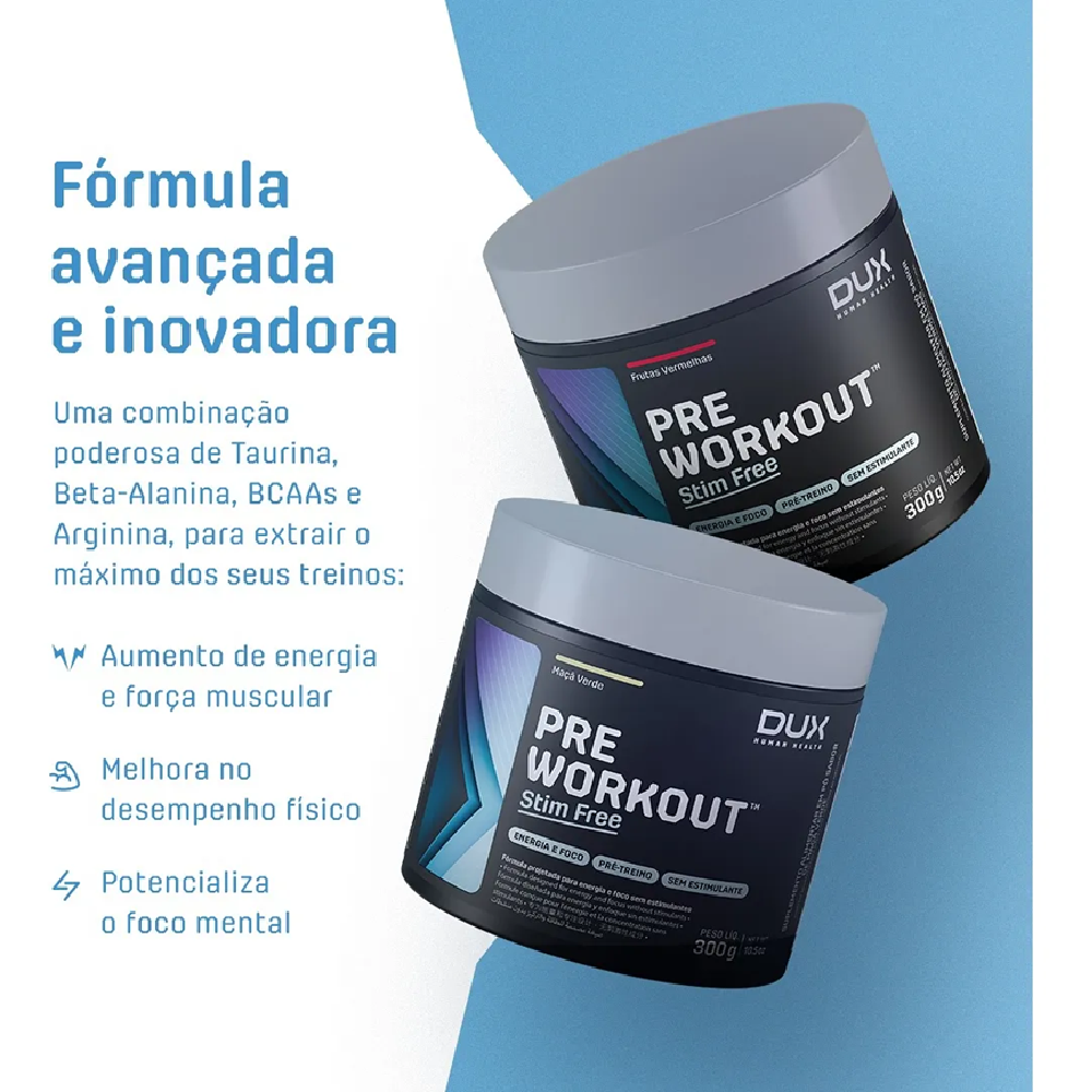 Pre Workout Stim Free DUX Human Health é um pré-treino inovador e livre de estimulantes. Desenvolvido para quem deseja performance máxima, energia e foco a qualquer hora do dia, sem interferir no sono ou causar desconfortos associados à cafeína.
